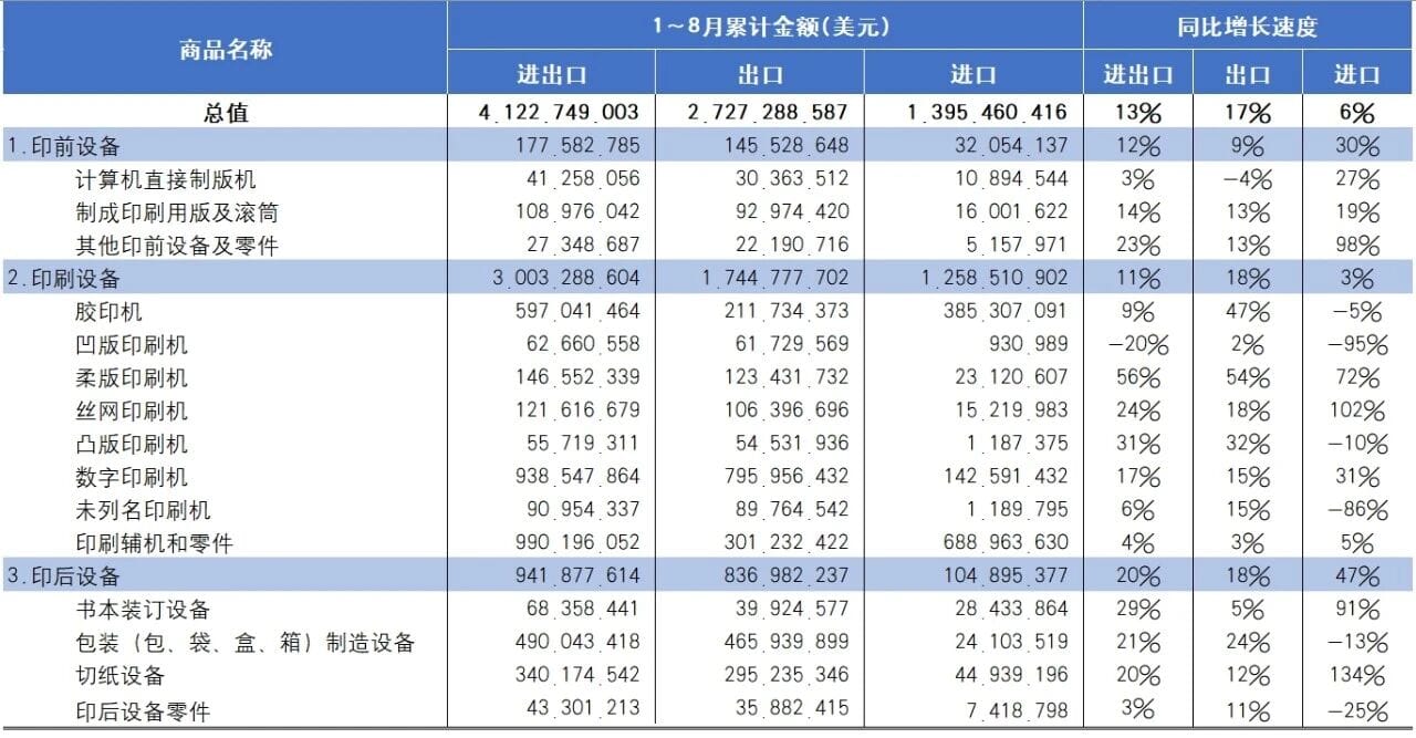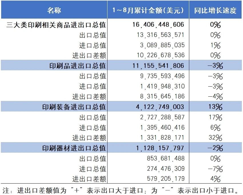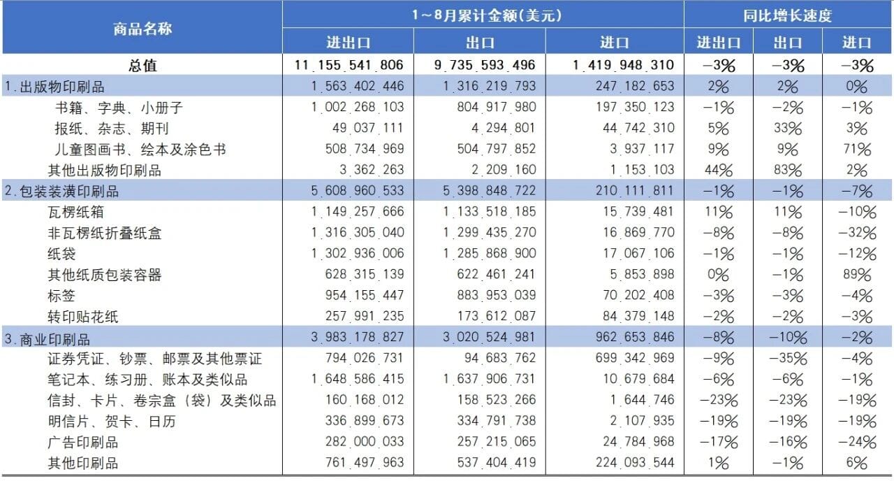 2025年1~8月国内三大类印刷相关商品进出口总体运行概况如下: