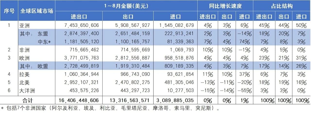进出口74.54亿美元,与去年同期相比增长4%。其中,出口59.09亿美元(同比增长3%)、进口15.45亿美元(同比增长6%)。同期,中国对东盟各国出口26.51亿美元(同比增长3%)、从东盟各国进口2.23亿美元(同比下降14%);中国对中东各国出口11.00亿美元(同比增长4%)、从中东各国进口8133.94万美元(同比增长74%)。