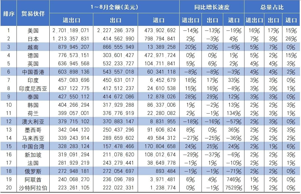 05/ 从主要进出口贸易伙伴交易额变化看,除对美国出口处同比下降状态外,居出口前五位的其他贸易伙伴维持增长;进口前五位的贸易伙伴,从美国和新加坡进口持续下降,其余贸易伙伴进口保持同比增长