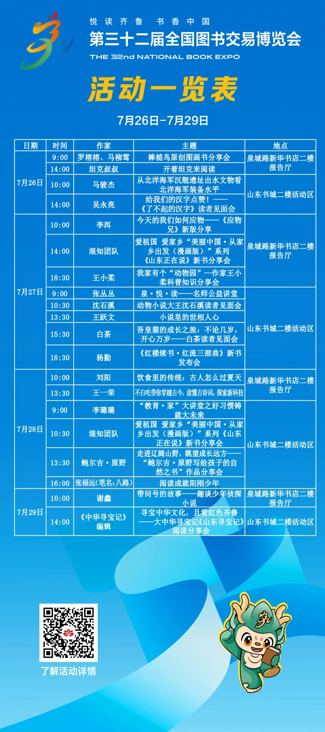 本届书博会以“悦读齐鲁 书香中国”为主题,由国家新闻出版署主办,山东省人民政府、济南市人民政府承办。据介绍,第32届书博会除了在济南山东国际会展中心设立主会场之外,还在济宁市、威海市设立分会场。